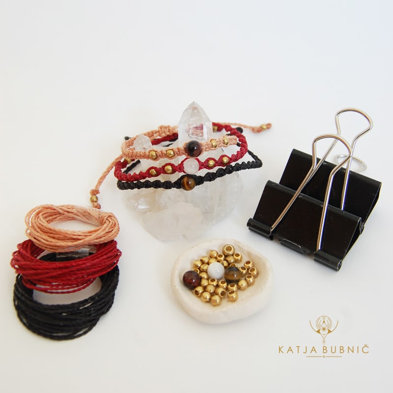 - 3 x narezane povoščene makrame vrvce Linhasita (2x100cm in 1x 50cm črne vrvice; 2x100cm in 1x 50cm bež vrvice; 2x100cm in 1x 50cm temno rdeče vrvice)